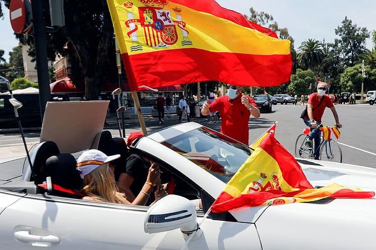 Grandes hileras de automóviles, desde los que ondeaban banderas de España, salieron a las calles del centro de las ciudades españolas, después de que consiguieran la autorización por parte de los tribunales, ya que al estar el país en estado de alarma, está limitada la libertad de movimientos y las reuniones numerosas de personas, con el fin de impedir la propagación del virus.