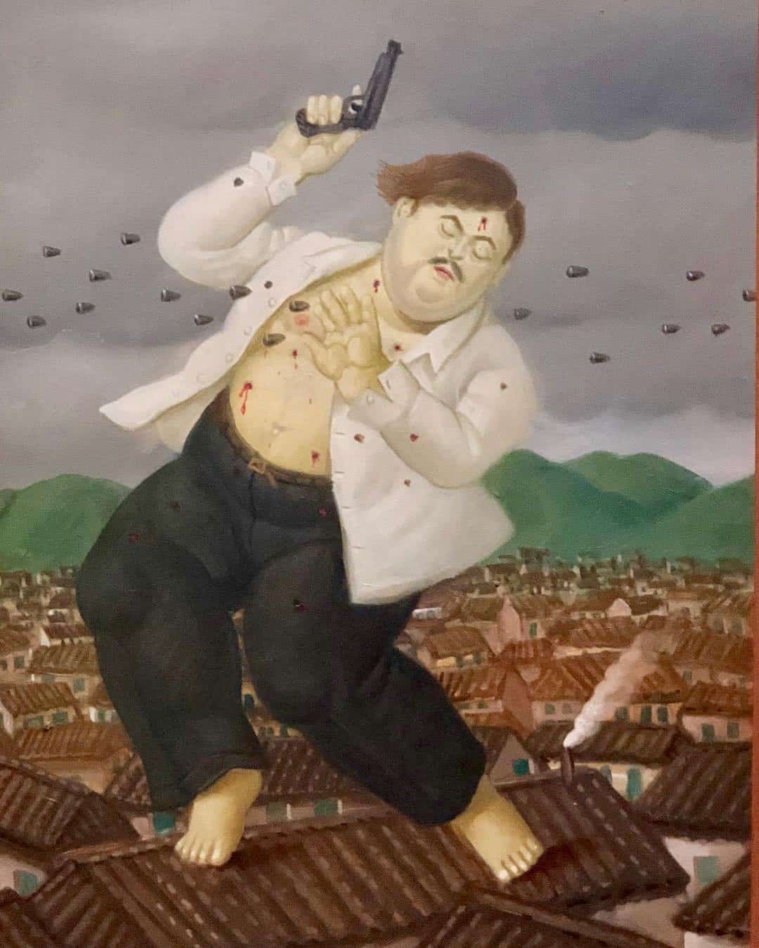 «Los que dicen que esa pintura es un homenaje a Pablo Escobar me han malinterpretado. No lo es, en absoluto. ¿Cuántos libros, cuántas películas se han hecho por ejemplo sobre Al Capone? Se han hecho no porque sus autores pensaran que Al Capone era maravilloso, sino porque es parte de la Historia de Estados Unidos. Escobar es parte de la realidad colombiana, y yo pinté un cuadro suyo en el momento en que lo estaban baleando, y luego lo pinté ya muerto sobre el techo de una casa», cuenta el artista.
