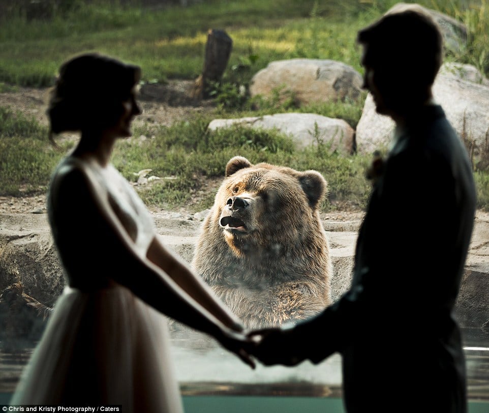 «Así que nos casamos en el Zoológico, y este oso tuvo una reacción interesante», escribió con el nombre de usuario DrBaumli.