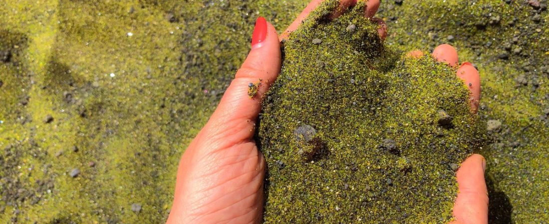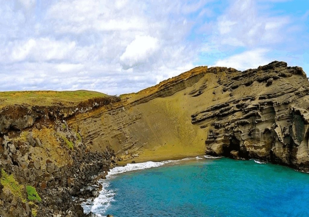 En la Big Island de Hawái se encuentra una de las cuatro playas de arena verde que existen en el mundo. Su color proviene del olivino, un mineral formado tras erupciones volcánicas que, por su peso, permanece en la costa mientras las olas arrastran otros sedimentos más ligeros. Para llegar a esta playa es necesario realizar una caminata de varias horas, lo que convierte la experiencia en un desafío tanto físico como visual.