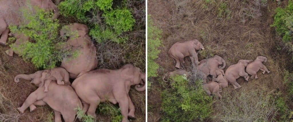 La manada de elefantes que está marchando en China fue vista tomando una descanso antes de continuar con su viaje