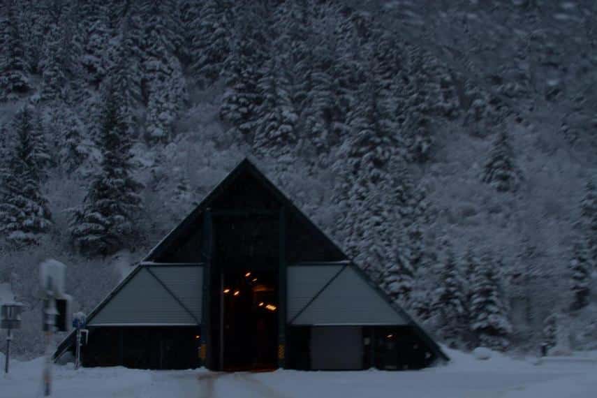 «Esto es lo primero que ves a medida que te acercas a Whittier», escribe. «El túnel de 4 kilómetros que hay que atravesar para entrar al pueblo solo tiene un carril – cambian el sentido cada 30 minutos. Tienes que esperar en este semáforo antes de que te dejen pasar»